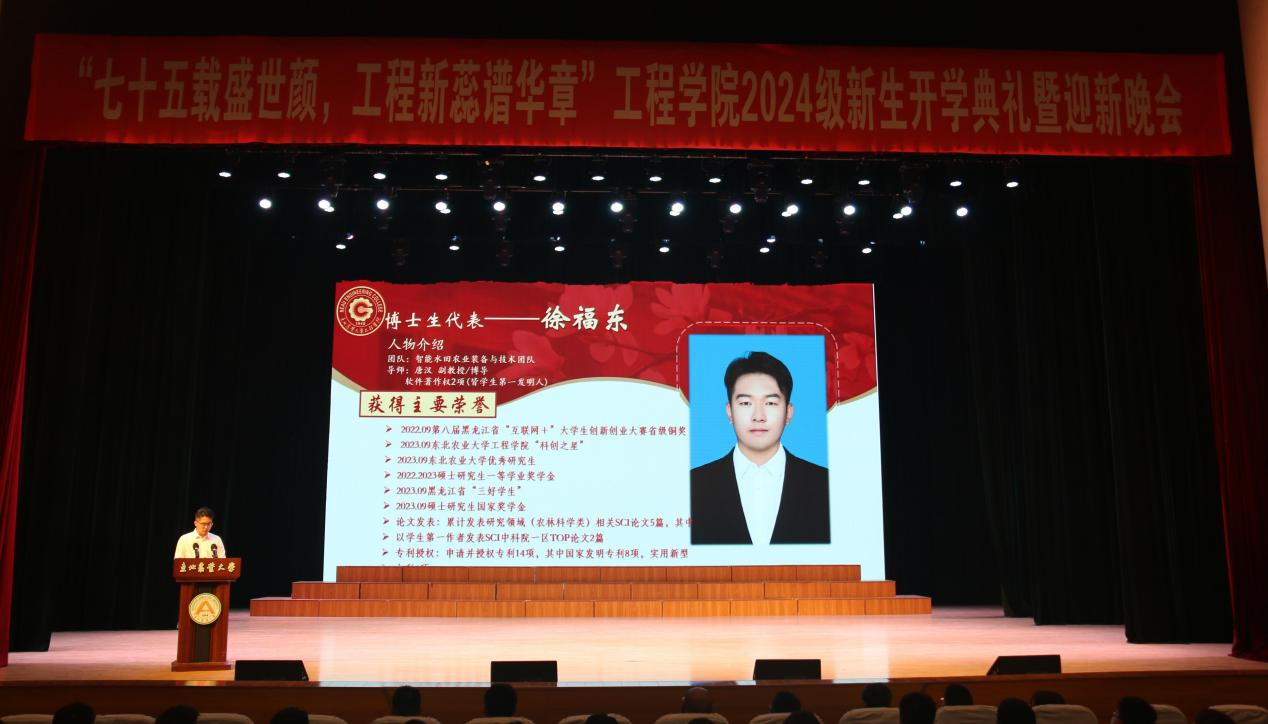 博士生导师、教授公维佳代表全体教师发言,她建议2024级新同学们虚心学习、潜心科研,敢于走出舒适圈,自信而坚定去实现人生梦想。高考成绩613分的本科新生代表机化2481班许博雅作分享了她对农业机械的兴趣与喜爱,并且对未来四年大学生活的无限期待。研究生新生代表博2401班徐福东发言中号召同学们要打牢基本功,拓展知识面,锻造硬脊梁”“铁肩膀”“真本事,为全面建设社会主义现代化强国贡献自己的青春力量。在校生代表机化2206班杨彦晖同学在发言中首先表达了对学院的感谢,随后以自身的成长经历鼓励新同学们砥砺前行,创造属于自己辉煌。
