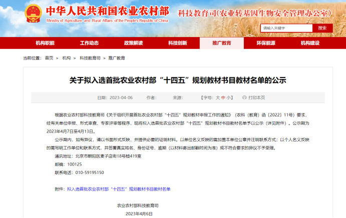 首批农业农村部“十四五”规划教材遴选结果公示