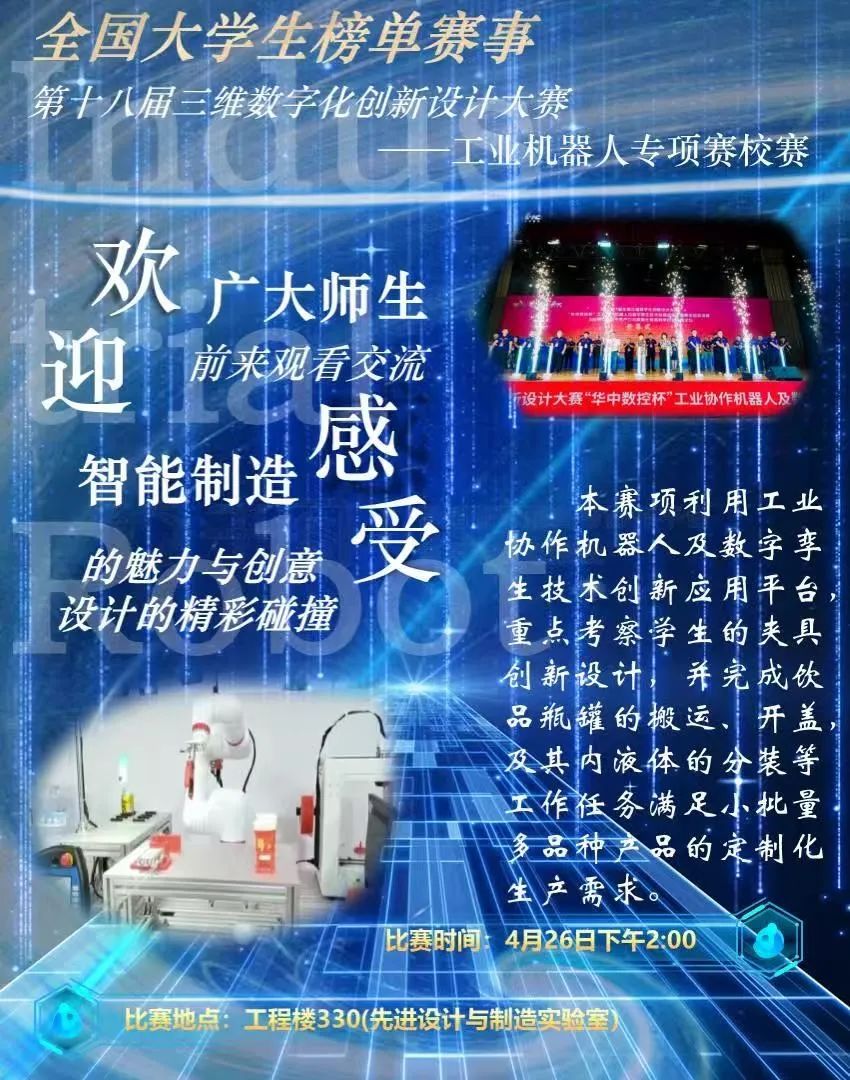 2025年4月27日下午两点,由我校必威betway西汉姆联承办的2025第18届全国三维数字化创新设计大赛“华中数控杯”工业协作机器人及数字孪生技术创新应用专项赛在工程楼330隆重举行。