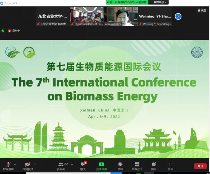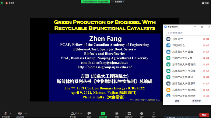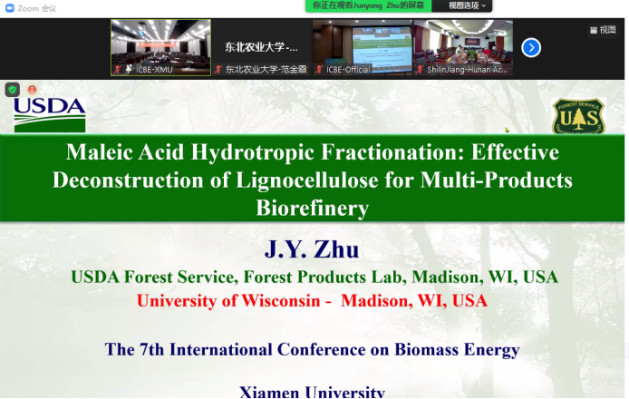 为促进生物质能源领域人才学术交流,培养专业兴趣,激发创新热情,推动生物质能源产业健康发展,4月8-9日,必威西汉姆联农业废弃物高值化利用学科团队教师和同学们线上参加了由中国可再生能源学会生物质能专业委员会、生物质能源产业技术创新战略联盟和厦门大学共同主办的第七届生物质能源国际会议暨第十五届全国研究生生物质能研讨会。会上听取了国内外领域权威专家谭天伟(院士)、陈勇(院士)、Zhu Junyong(USA)、Zheng Ying(Canada)、Zhen Fang(Canada)、Rafael Luque(Spain)、廖强、李昌珠的主旨报告以及青年科学家颜蓓蓓、曾宪海的精彩报告分享。