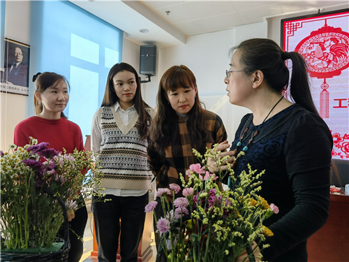 学院特邀哈尔滨学院风景园林高级工程师王启燕老师,现场介绍鲜花常识,对插花的发展历史及插花艺术进行详细讲解。学院女教职工对插花艺术兴趣极高,纷纷与王老师交流互动,请教插花专业知识并亲手制作插花作品。普通的花叶、枝条,经过大家精巧的修饰与加工之后,变成了令人赏心悦目的艺术品,在场的所有人在悠然的花香浸染间享受闲适与自然。