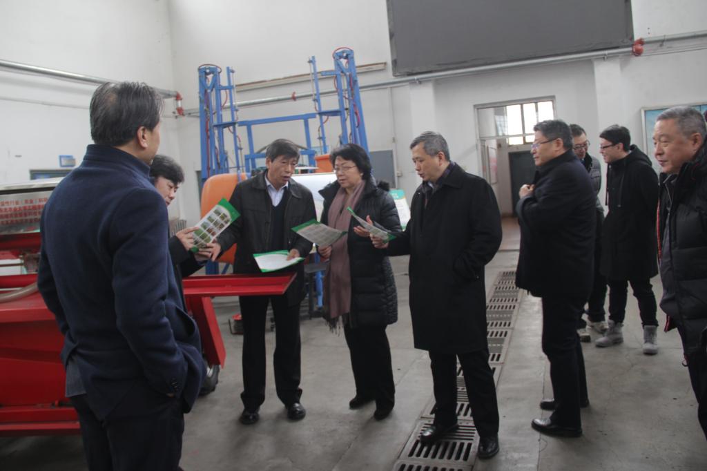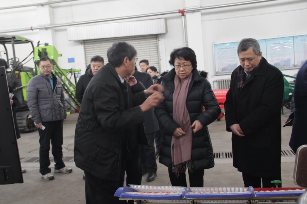 调研组到达农牧机械实验室后,院长陈海涛亲自上前迎接并为其详细讲解农产品技术。陈院长首先为调研组播放了割前脱粒联合收获机的介绍视频,随后就此设备与翁副部长进行了深入探讨。翁副部长对水稻的种植设备技术性能方面提出疑问,陈院长为他详细讲解了水稻插秧机的技术特点,并探讨了水稻的合理插秧对其收获的影响。