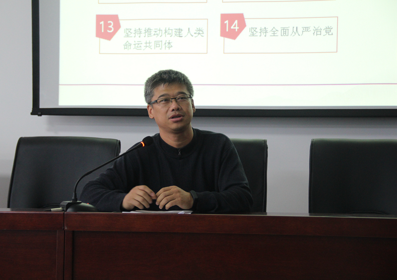 报告会开始,王锡胜首先传达了学校关于《学习十九大精神专题报告会暨党委理论学习中心组(扩大)学习会议》的指示精神,就学院党委关于学习贯彻十九大精神的要求做了部署。接着,王锡胜向与会师生党员解读了副校长苑芳江在学习会议上所做的题为《新时代马克思主义在中国的历史飞跃》的主题报告。王锡胜指出,苑芳江副校长的整部报告紧扣十九大精神,结合多部理论资料,从深刻领会党的十九大报告的主题、“三个维度”深刻认识党的十九大的划时代里程碑意义、新时代马克思主义在中国的历史飞跃以及习近平新时代中国特色社会主义思想四个方面带领大家共同学习了十九大精神。图文并茂,纵横有序,脉络清晰,把握准确,是我院学习十九大精神的重要依据,各党支部必须认真研读,深入分析,准确传达,以传达学习专题报告会会议精神及学习主题报告为契机,掀起全院师生深入学习十九大精神热潮!