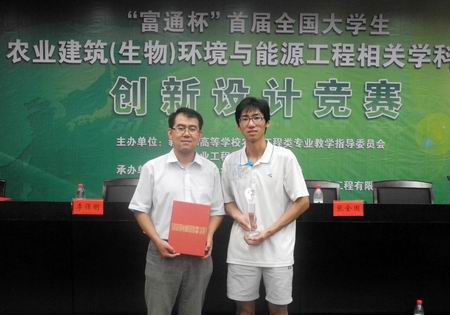 此次竞赛由教育部高等学校农业工程类专业教学指导委员会、中国农业工程学会主办,中国农业大学、江苏大学承办。竞赛以“美丽乡村与现代农业工程”为主题,根据我院农业建筑(生物)环境与能源工程专业特点与研究方向,竞赛内容共分为生产工艺与环境类、建筑设施与设备类、清洁能源工程类以及乡村人居环境类四大类。经过了各参赛学校内部的初选后,本次竞赛共有来自中国农业大学、浙江大学、华南农业大学、吉林大学、江苏大学等20所高校的48个代表队、200余名参赛代表参加了竞赛。此次比赛特别设立了特等奖三项,其余为一等奖、二等奖和优秀奖。我院代表队的参赛作品为“聚风式垂直轴风光互补风力发电机”。在为期两天的竞赛中,参赛同学在模型讲解和答辩中准备充分,回答问题思路清晰、语言流畅、表现出色,受到了评委老师和同学们的一致认可,最终与中国农业大学、河南农业大学的作品一起获得特等奖。