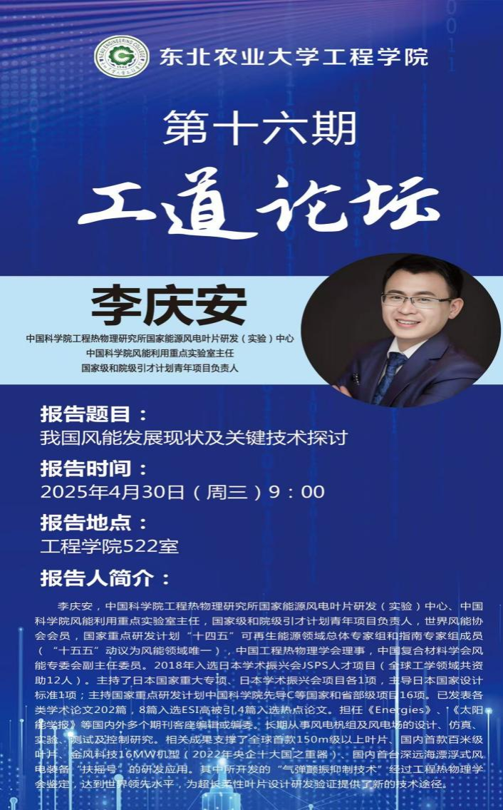 李庆安,中国科学院工程热物理研究所国家能源风电叶片研发(实验)中心、中国科学院风能利用重点实验室主任,国家级和院级引才计划青年项目负责人,世界风能协会会员,国家重点研发计划“十四五”可再生能源领域总体专家组和指南专家组成员(“十五五”动议为风能领域唯一),中国工程热物理学会理事,中国复合材料学会风能专委会副主任委员。2018年入选日本学术振兴会JSPS人才项目(全球工学领域共资助12人)。主持了日本国家重大专项、日本学术振兴会项目各1项,主导日本国家设计标准1项;主持国家重点研发计划中国科学院先导C等国家和省部级项目16项。已发表各类学术论文202篇,8篇入选ESI高被引,4篇入选热点论文。担任《Energies》、《太阳能学报》等国内外多个期刊客座编辑或编委。长期从事风电机组及风电场的设计、仿真、实验、测试及控制研究。相关成果支撑了全球首款150m级以上叶片、国内首款百米级叶片、金风科技16MW机型(2022年央企十大国之重器)、国内首台深远海漂浮式风电装备“扶摇号”的研发应用。其中所开发的“气弹颤振抑制技术”经过工程热物理学会鉴定,达到世界领先水平,为超长柔性叶片设计研发验证提供了新的技术途径。