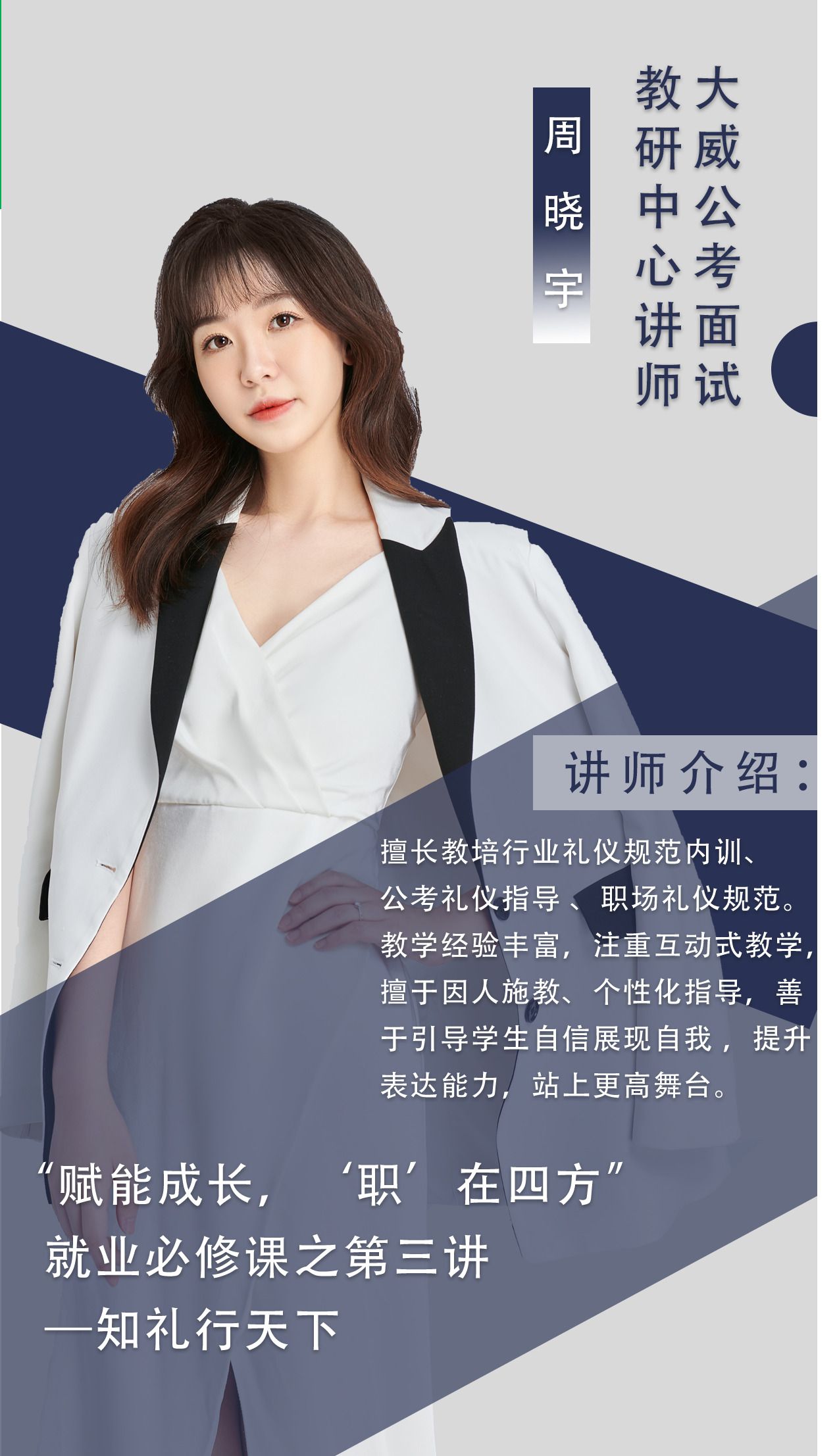 报告人简介:周晓宇,毕业于必威西汉姆联,大威公考面试教研中心王牌人气讲师。擅长教培行业礼仪规范内训、公考礼仪指导、职场礼仪规范、形体仪态塑造。教学经验丰富,授课循循善诱,注重互动式教学,擅于因人施教、个性化指导,在幽默活泼的课堂氛围中解决学员的疑难点。善于发现学员兴趣,引导其自信展现自我,提升表达能力,站上更高舞台。