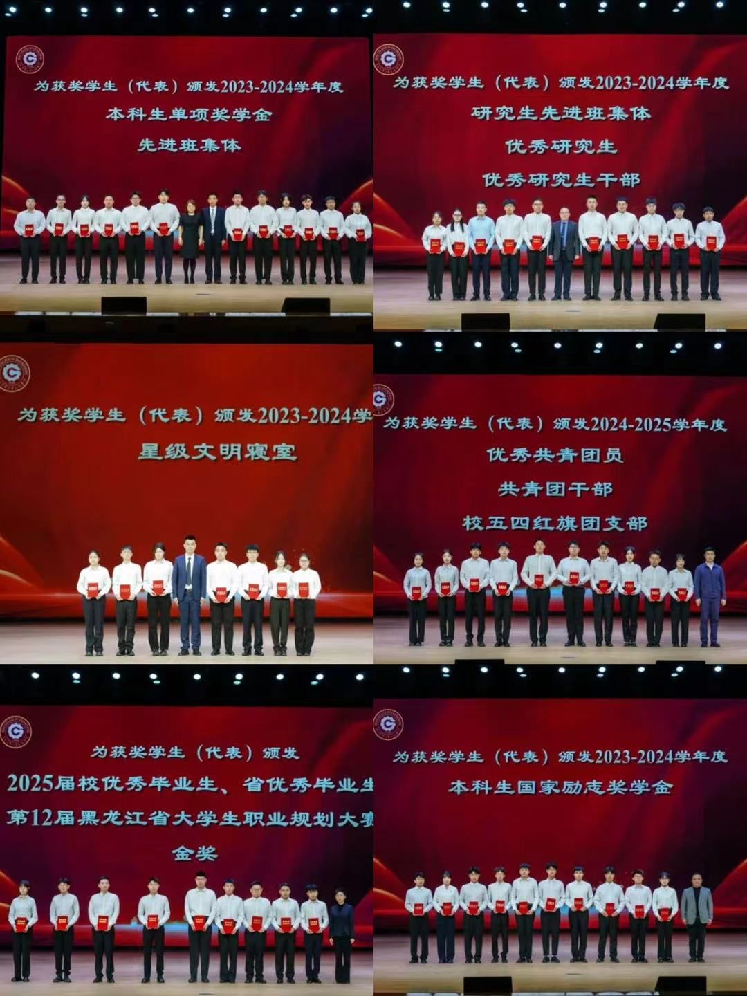 会上,孟繁美、杨秀坤、李龙海、窦大昶、黄步海分别宣读了《关于颁发2023—2024学年度本科生单项奖学金、先进班集体的决定》《关于表彰2023-2024学年度研究生先进班集体、优秀研究生、优秀研究生干部及省级以上优秀个人的决定》《关于表彰2023-2024学年度星级文明寝室的决定》《关于表彰2023-2024学年度优秀共青团员、共青团干部及校五四红旗团支部的决定》《关于表彰2025届校优秀毕业生、省优秀毕业生的决定》《关于表彰第12届黑龙江省大学生职业规划大赛金奖获奖者的决定》《关于颁发2023—2024学年度国家励志奖学金的决定》《关于颁发2023—2024学年度本科生国家奖学金、研究生国家奖学金的决定》,与会领导为获奖集体和个人颁奖。