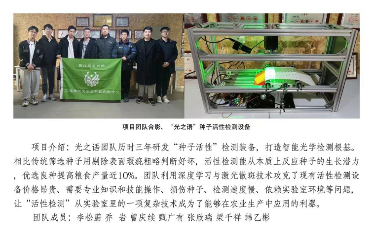 本届“挑战杯”大赛坚持“创新、聚智、安全”的办赛理念,设科技创新和未来产业、乡村振兴和农业农村现代化、社会治理和公共服务、生态环保和可持续发展、文化创意和区域合作五个组别,共吸引全国3011所学校的142.4万名学生参与,累计提交作品33万个,其中1544个项目入围国赛,共有463个项目晋级全国决赛终审答辩。我院“光之语——打造‘种子活性’智能光学检测根基”团队经过层层选拔、一路过关斩将,出色完成终审答辩,喜获佳绩。