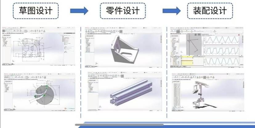 首期课程由郭连琦主讲,以“SolidWorks模型创建始于二维草图,如同建筑地基”为核心观点,系统讲解新建草图、派生草图、零件面绘制草图三种方法,指导学生掌握基础图形绘制、草图操控面板使用及智能标注技巧,通过机械小车建模成果展示,强化“草图是设计之源”的认知。
