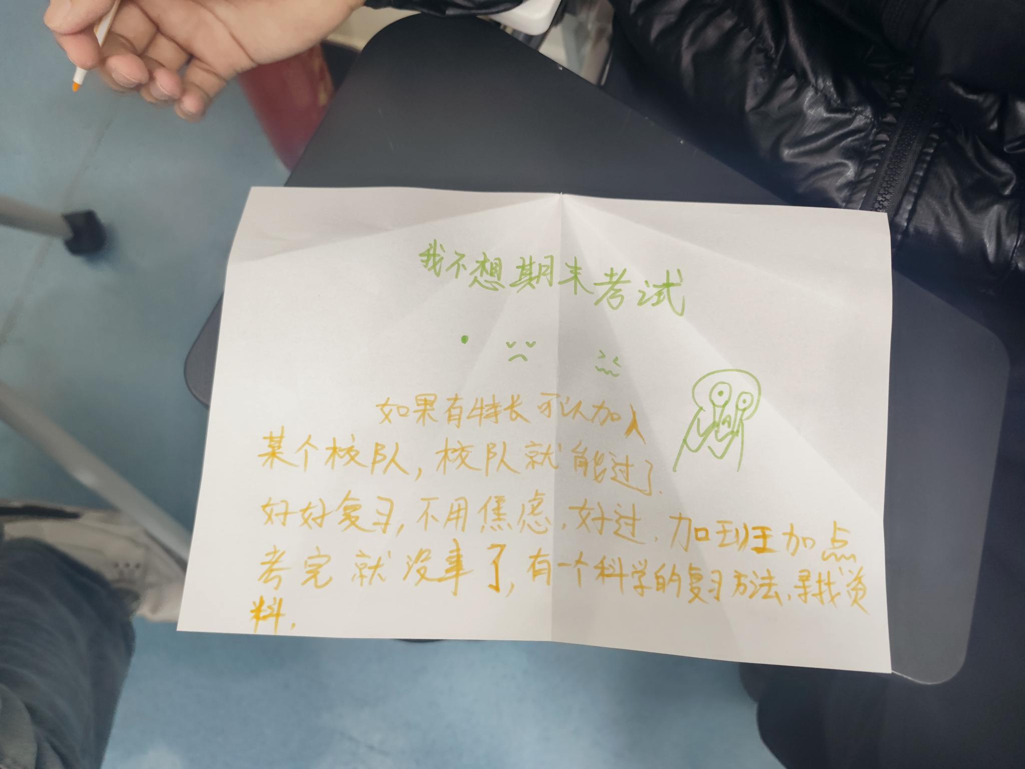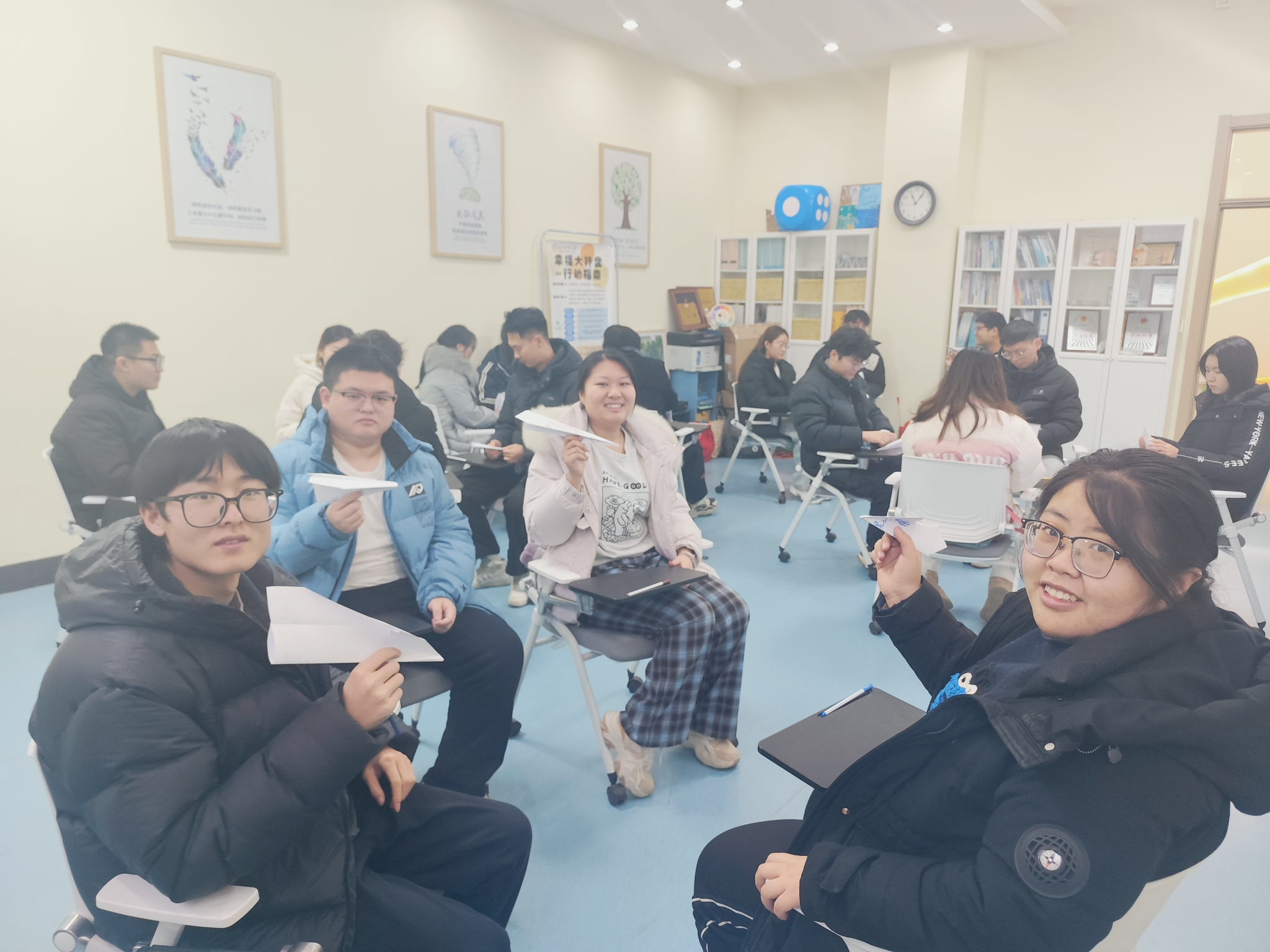 在分组交流环节,同学们彼此介绍、倾听分享,建立起真诚的心灵连接。紧随其后的“放飞压力”活动则别具匠心,大家将近期压力匿名写下,折成纸飞机随机放飞,并共同为抽取到的压力事件提供建议与支持,在实践中学习共情与互助。