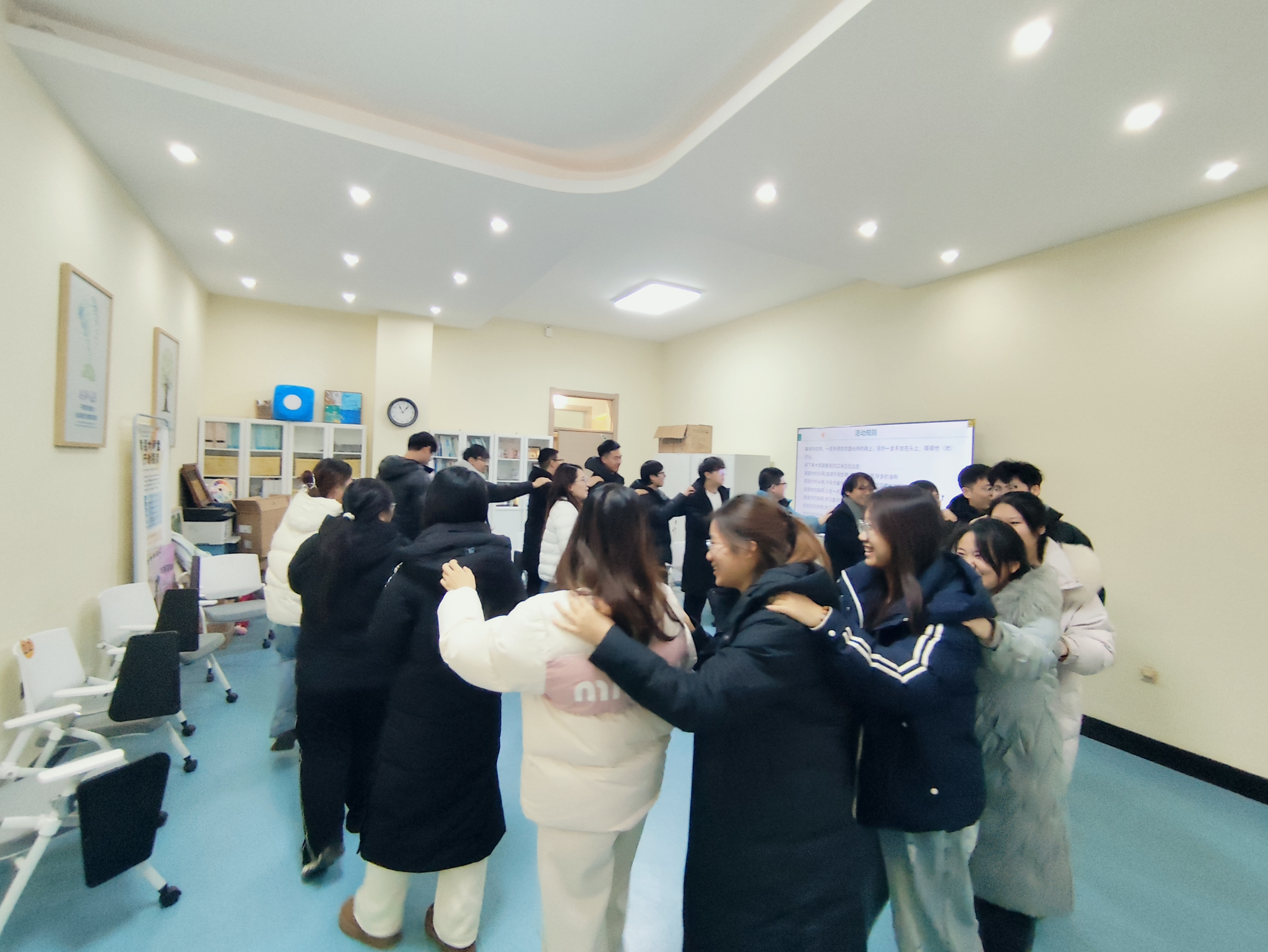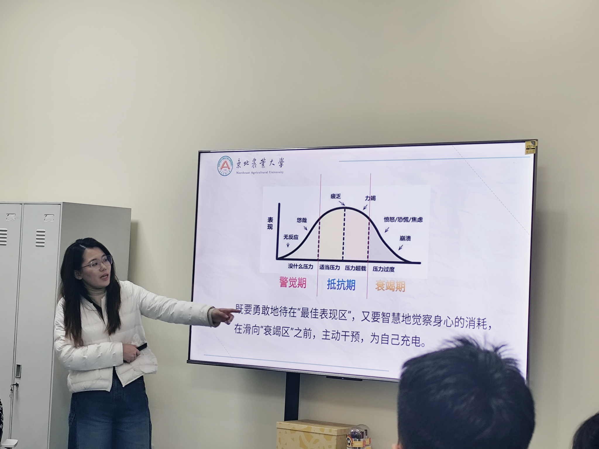 姚雪老师结合专业知识,系统讲解了压力的情绪、认知、行为与生理信号,并借助耶克斯-多德森定律和压力阶段曲线,阐释了适度压力的积极意义与科学调节方法,引导同学们识别自身状态,保持在“最佳表现区”。活动最后,全体成员共同参与“集体按摩操”,在轻松的动作与欢声笑语中传递关怀、释放紧张,为本次辅导画上了温暖而有力的句号。